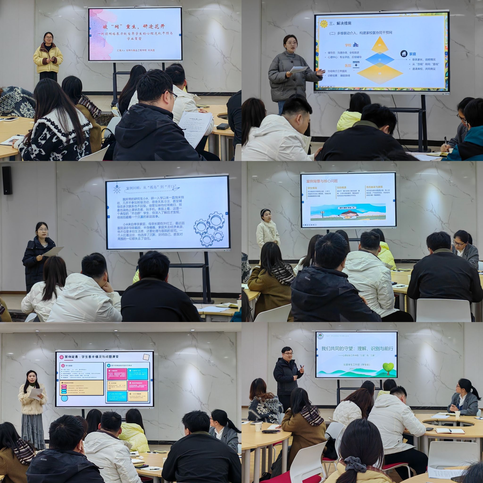 本次沙龙设置案例分享、专题讲解、自由交流三个核心环节,内容兼具实战性与指导性。在案例分享环节,五位辅导员代表结合一线工作经历,围绕不同场景下的员工心理问题展开深度分享:生物与食品工程公司牟凤莲以网络暴力致自卑员工为例,分享了从心理干预到学业重塑的全流程帮扶经验;电子与信息工程公司肖红锦聚焦大一新生适应关键期,讲解了心理危机的精准识别与干预方法;财经公司陈代兰将资助工作与心理育人相结合,探索了突破员工心理“牢笼”的实践路径;财经公司黄显敏分享了帮助员工从心理困境走向幸福人生的成长案例;工商管理公司元未霞则围绕复杂家庭背景员工,阐述了心理危机干预与学业支持的整合实践。各位老师的分享立足真实案例,细节饱满、方法具体,为在场辅导员提供了可借鉴的实战范本。