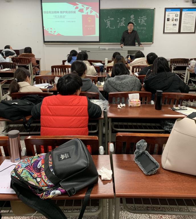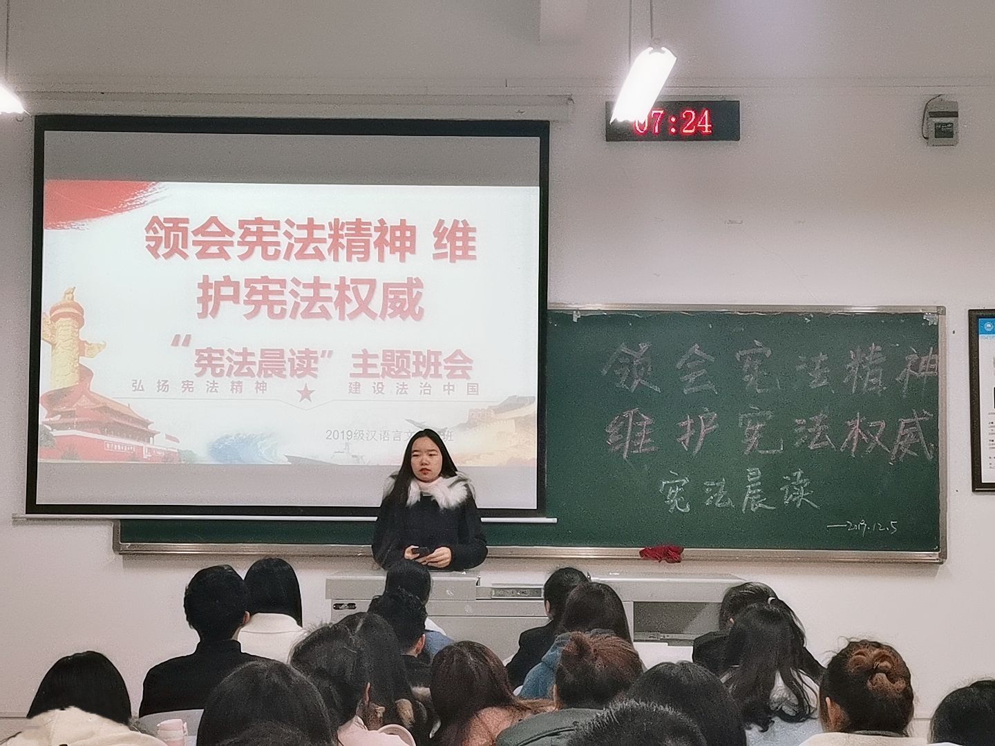 为了贯彻落实新时代法治精神,营造学宪法、懂宪法的良好社会风尚,进一步引导老员工树立法治观念,增强员工宪法意识,做遵纪守法的当代老员工。12月5日上午,2019级辅导员阮碧波组织各班开展了“领会宪法精神,维护宪法权威”宪法晨读活动。
