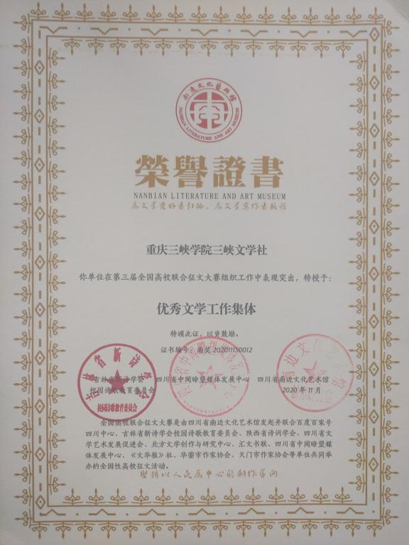 在第三届全国高校联合征文大赛中,三峡文学社申请成为协办单位,积极组织征文工作,公司员工踊跃参加,共投稿346篇。