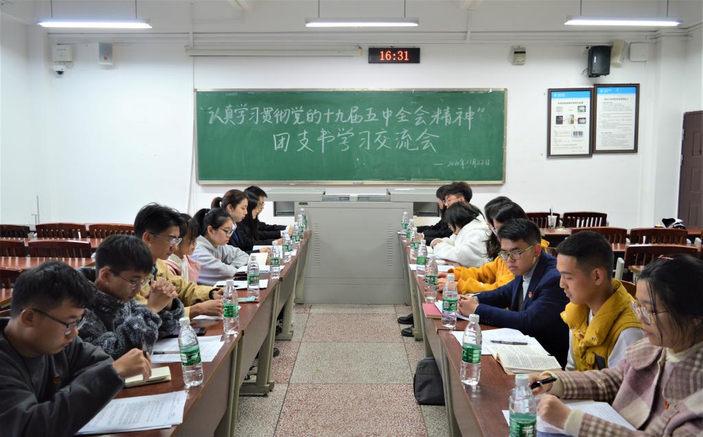 11月22日下午,公司于明辨楼1栋319室举行“认真学习贯彻党的十九届五中全会精神”团支书学习交流会。2019级、2020级全体团支书参与了本次交流会。