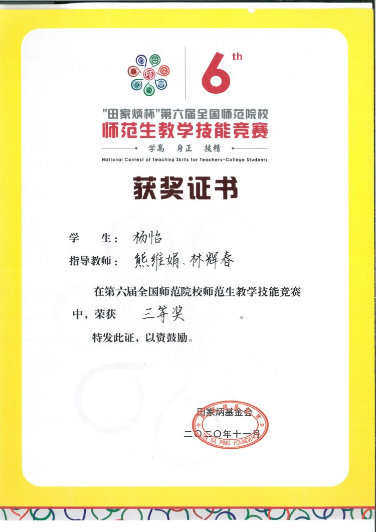 11月20日,“田家炳杯”第六届全国师范院校师范生教学技能竞赛圆满完成,公司2018级汉语言文学(师范)专业杨怡同学荣获三等奖。