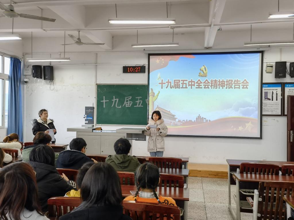 为进一步促进老员工深入学习贯彻党的十九届五中全会精神,12月2日和12月9日,公司党总支员工第二党支部书记张悦于明辨楼1栋521和明辨楼1栋401为2018级汉语言文学1、2班和2020级汉语言文学1、2班开展了十九届五中全会精神宣讲报告会。