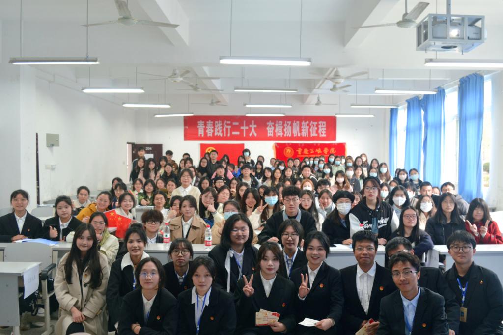 首先,由主持人带领同学们领唱团歌,在慷慨激昂的团歌声中,本次团日活动正式拉开帷幕。接着,通过观看党的纪录片,同学们更加了解了党的精神与发展历程。随着《二十大开创新征程》、《红船入梦》和《我和我的祖国》悠扬的朗诵与合唱,在场的每一位更坚定了青年要听党话,跟党走的决心;在倾听了当代“愚公”毛相林的感人肺腑故事之后,同学们深深铭记着新时代先进分子笃行不怠、吃苦耐劳的精神。紧接而来的知识竞答环节,让同学们在紧张与激情中迸发对党与国家的热忱。最后,由优秀团支书和优秀团员代表上台发言,她们精彩铿锵的发言鼓舞着同学们奋发向上,勇毅前行。