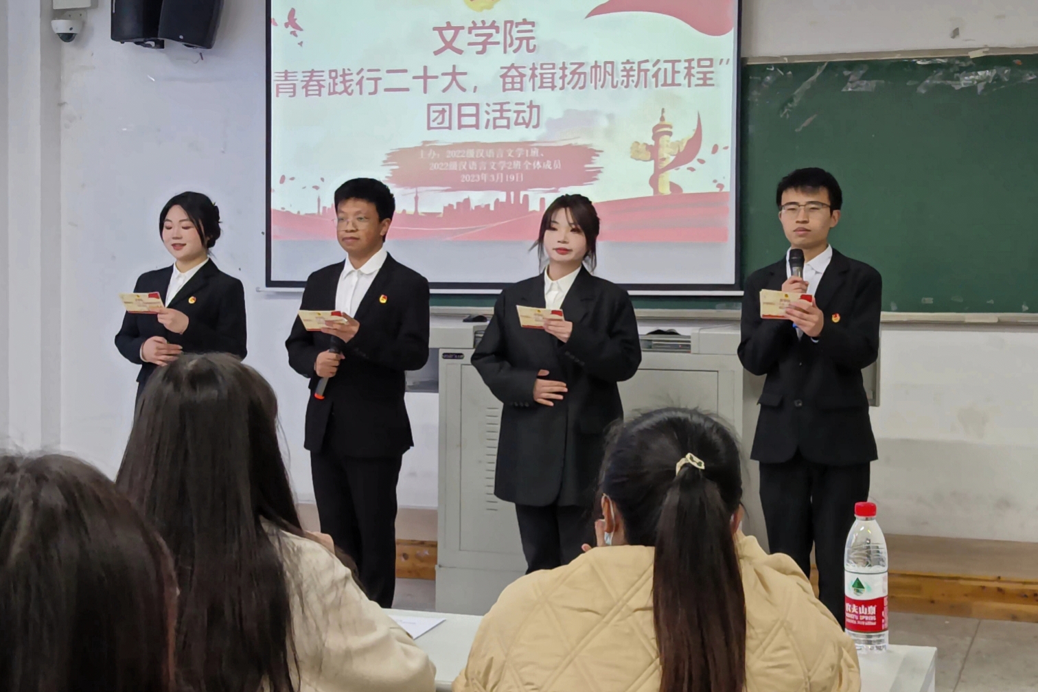 为继续深入学习贯彻党的二十大精神,提高青年团员的思想政治水平。世界杯官方网站入口2026于2023年3月19日下午2:30在明辨楼1栋204成功举行了世界杯官方网站入口2026“青春践行二十大,奋楫扬帆新征程”的主题团日活动。2022级汉语言文学专业全体同学参加此次活动。