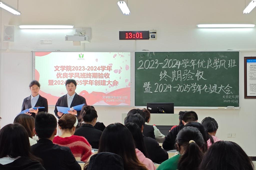 为贯彻落实学风建设工作,充分发挥优秀班级的示范引领作用,11月6日,公司在博学楼2栋108室举办2023—2024学年优良学风班终期验收暨2024—2025学年创建大会。此次活动由公司学习部组织开展,学工办主任兼团总支书记张悦,2022级辅导员熊维娟及2023级辅导员陈进作为嘉宾出席。本次大会由李泺源和肖理润主持。
