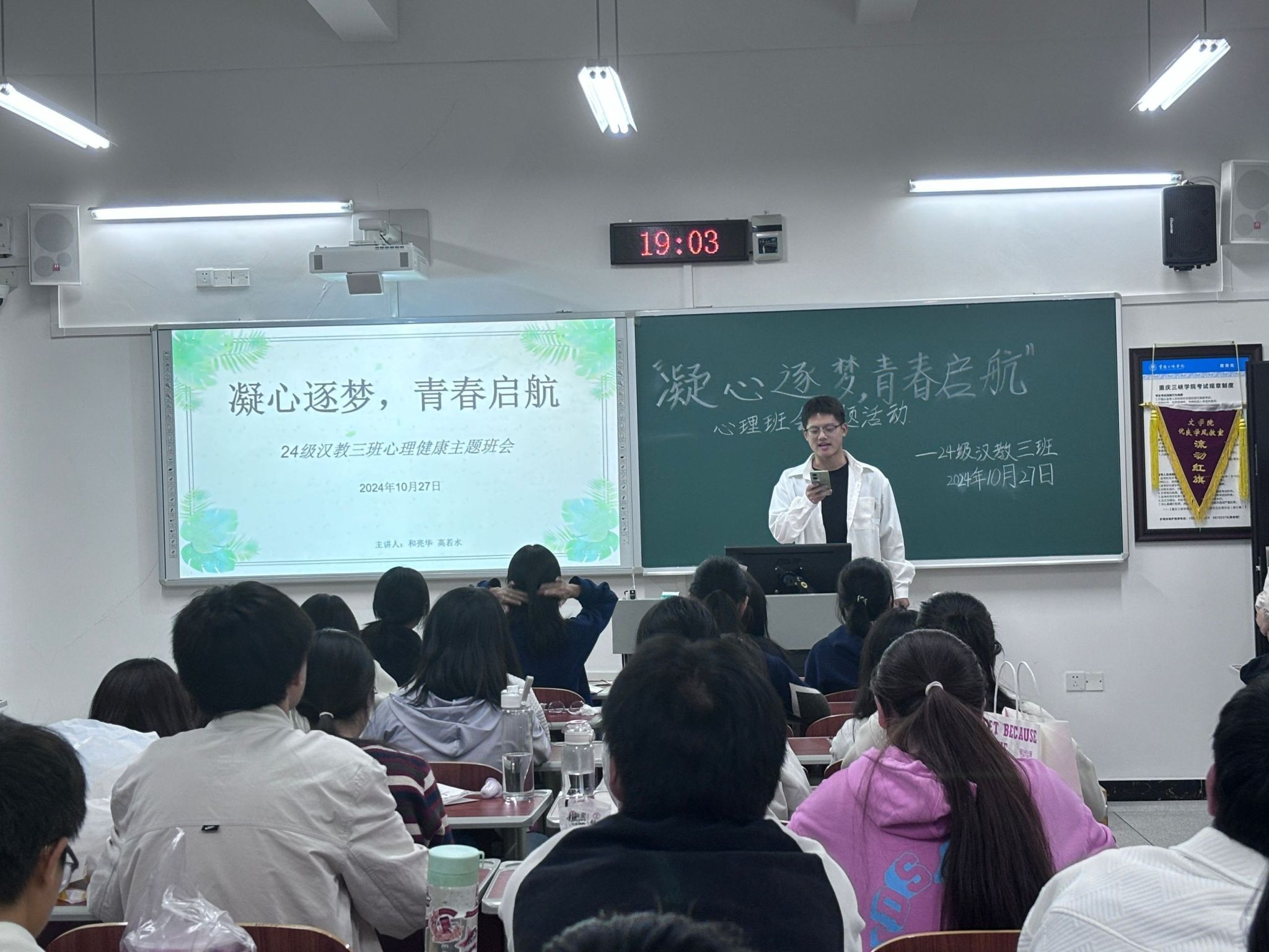 班会围绕心理健康的多个方面内容展开。首先,同学们详细了解了世界精神卫生日的由来和意义,深刻认识到精神健康与身体健康同等重要的地位。而在心理健康标准与重要性环节,大家新认识到良好人际关系、积极情绪状态等属于心理健康的重要标志,还一同探讨了青少年常见的自卑、逆反、焦虑、抑郁等心理问题。另外,为助力同学们更好地掌握心理调适方法,班会特别设置了诸多趣味游戏,借助游戏的轻松氛围,同学们体验到情绪宣泄、积极暗示等心理调适技巧的重要性。