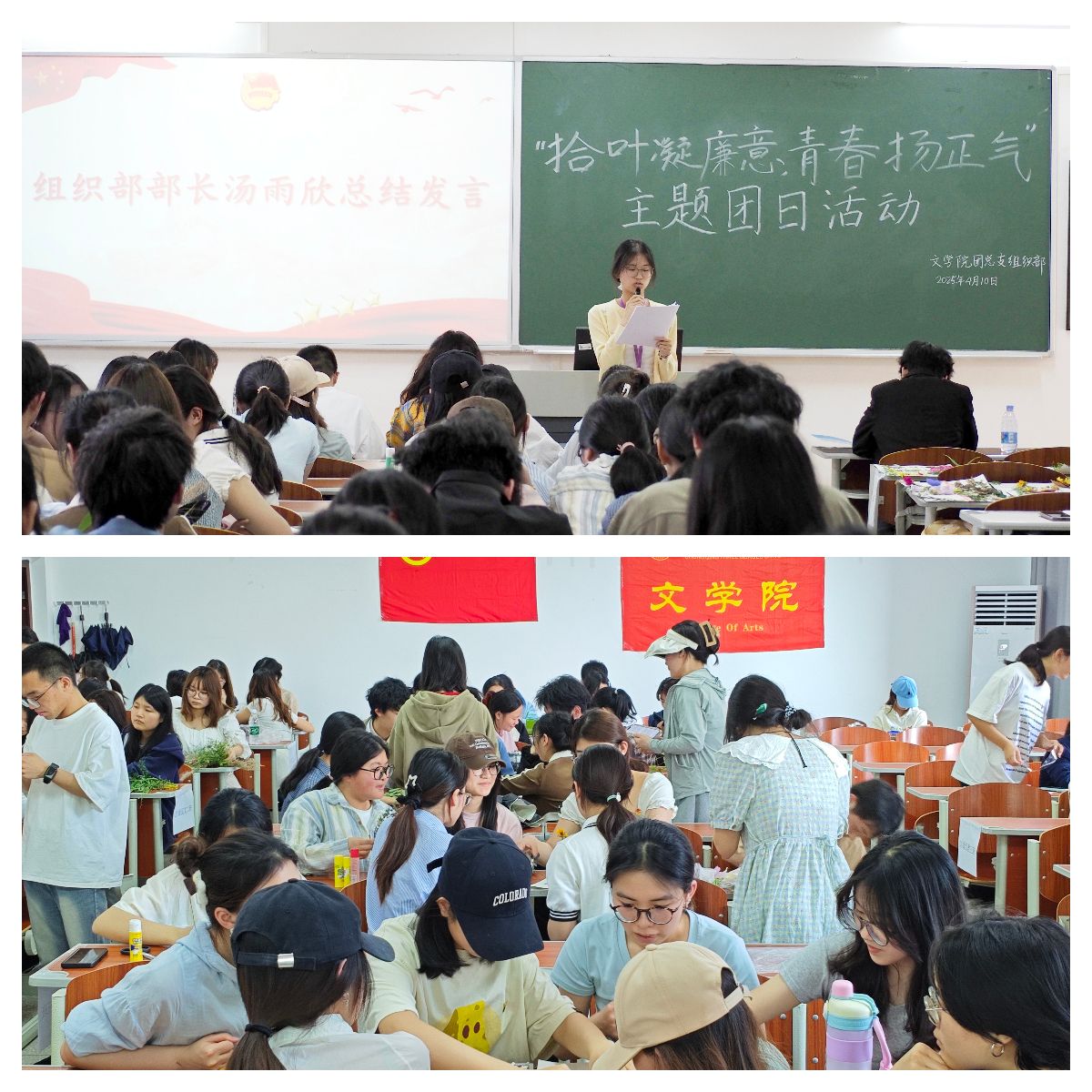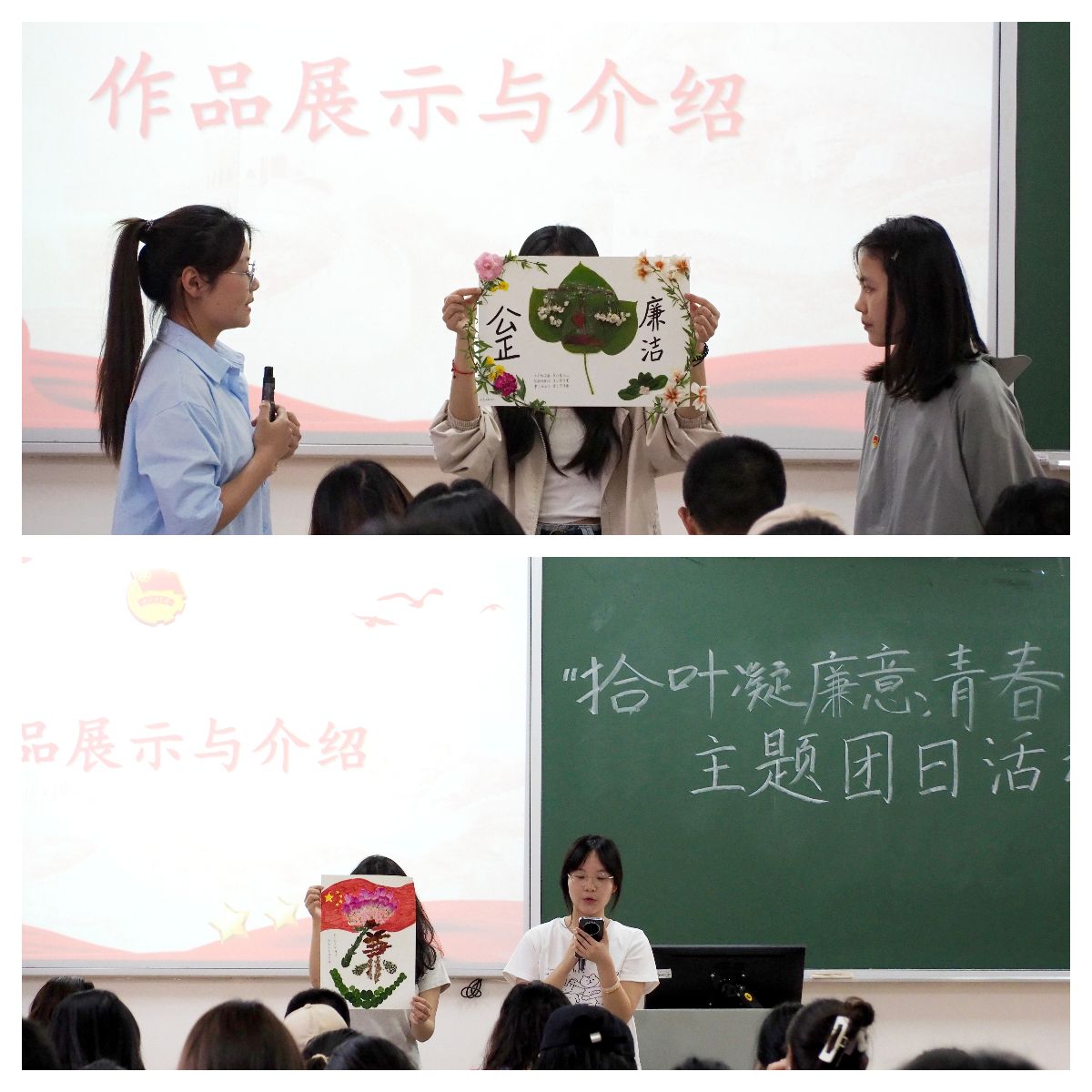 活动以小组合作的形式展开,每班8名同学为一组,大家在校园中采集落叶、落花等自然材料,结合廉洁主题进行创意手工制作。各小组充分发挥想象力与团队协作能力,将自然元素与廉洁文化巧妙融合,创作出一件件构思精巧、寓意深刻的作品。在分享环节中,同学们围绕作品的设计理念和廉洁内涵进行讲解,展现了青年一代对清廉正气的深刻理解与独特诠释。