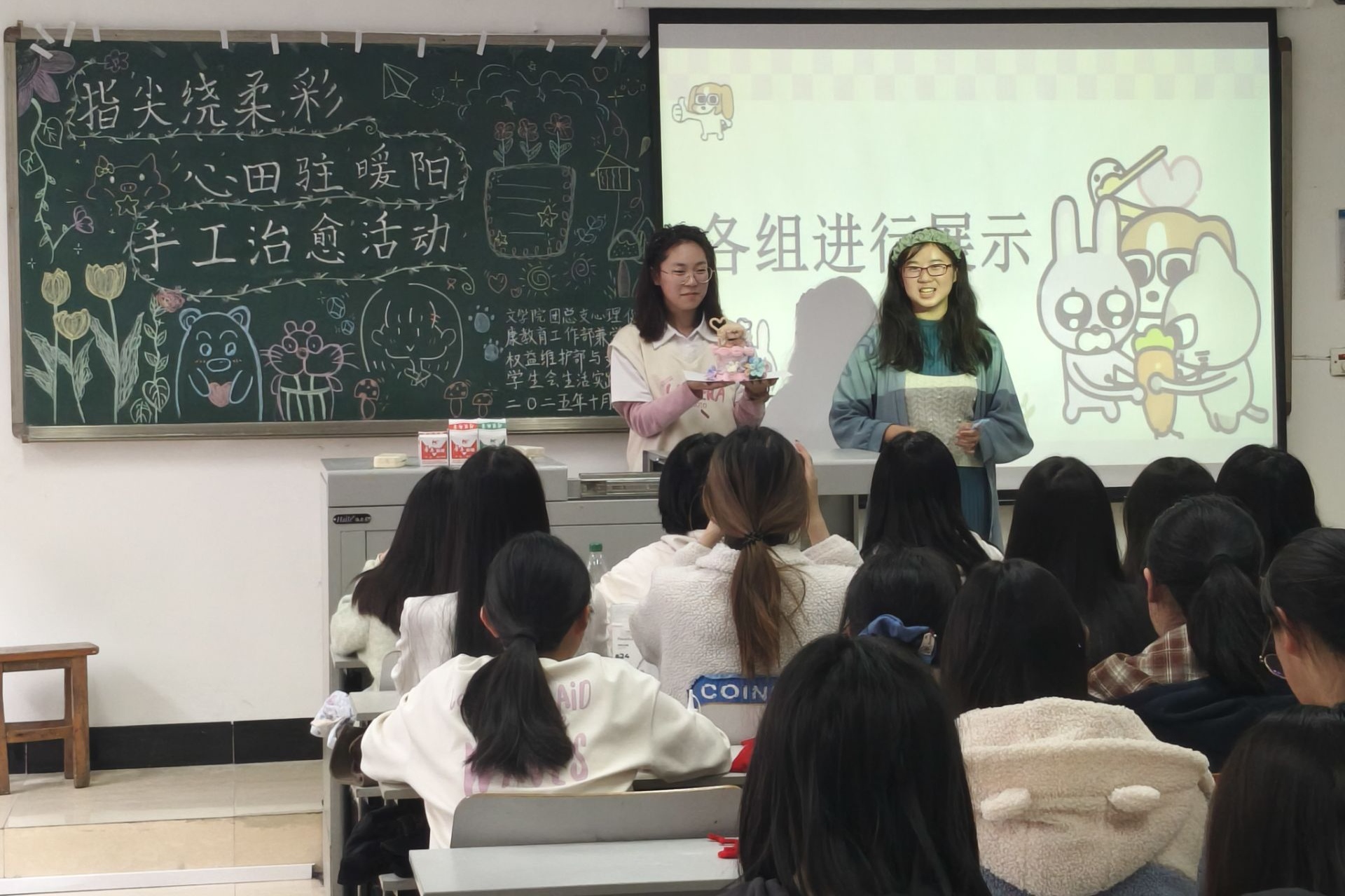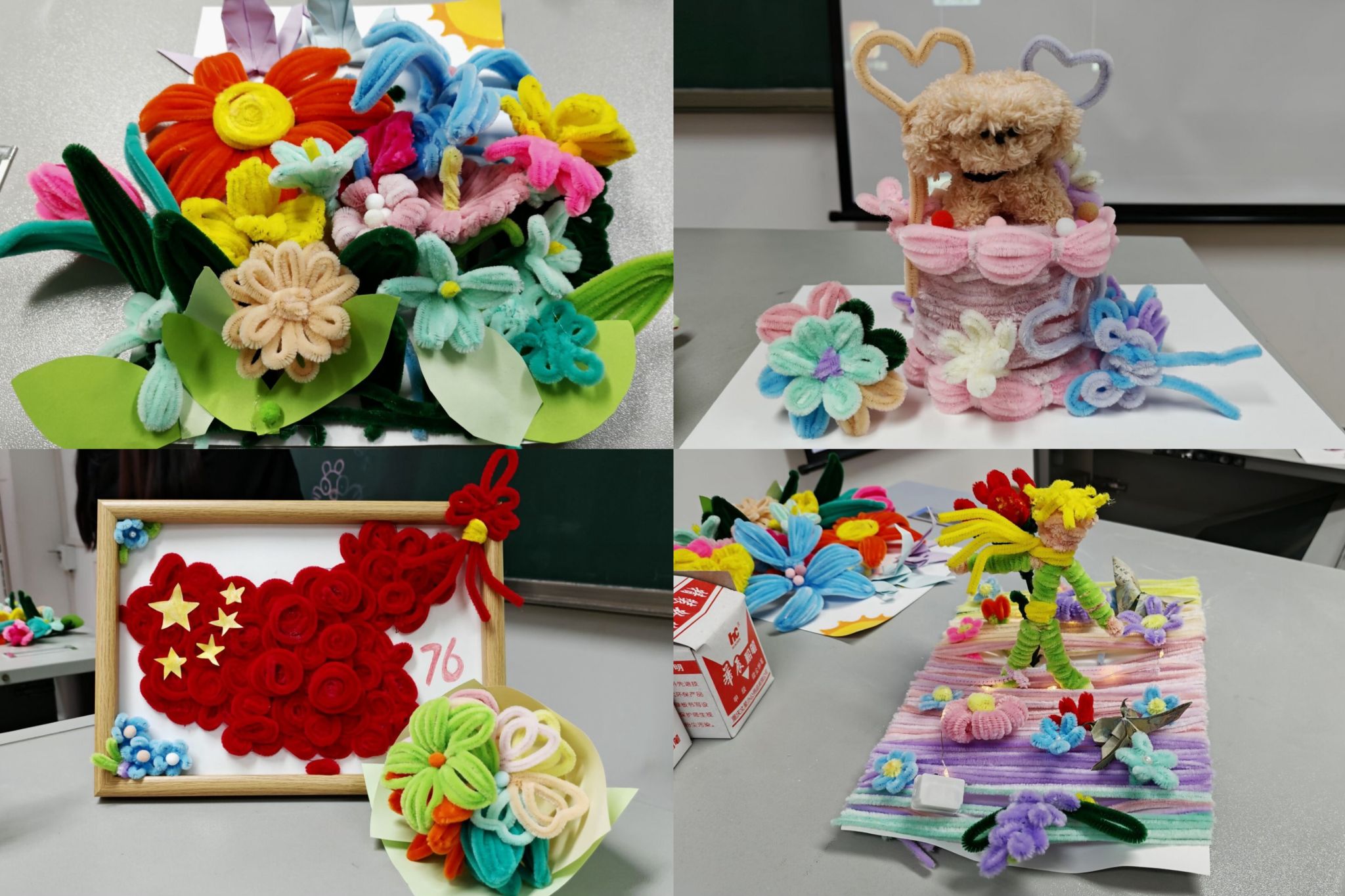 活动现场,缤纷的材料铺满桌面,欢声笑语不绝于耳。在“让每一次缠绕都变成对世界温柔的告白”这一温情理念的引领下,同学们以小组为单位,将扭扭棒化作绽放的花朵、灵动的小动物或各种充满想象力的造型。同学们在专注创作中暂忘学业压力,感受手作带来的宁静与成就感。一位参与活动的同学分享道:“在缠绕扭扭棒的过程中,我感受到了久违的宁静。当作品在手中一点点成型时,那种成就感真的很治愈。”这正是活动的初衷——让同学们在创作中找回内心的节奏,在色彩的世界里安放情绪,让手工成为一剂温柔的心灵良药。随后,在小组展示环节,各小组派代表将作品进行展示,并由评委进行公正的评分。最后,主持人宣布比赛结果,并由嘉宾为获奖小组代表颁发奖状。
