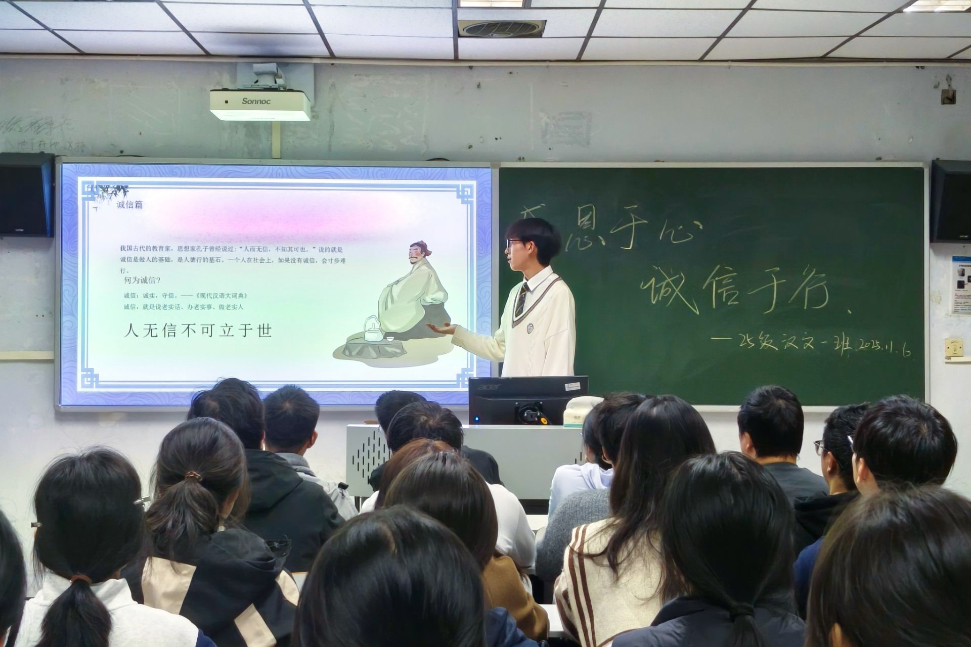 辅导员围绕“感恩”与“诚信”两大主题展开讲解。在感恩篇中,辅导员从感恩父母的血脉养育、无私守护,到感恩教师的传道授业、润物无声,再到引导员工珍惜当下生活、摒弃抱怨心态,通过具象化的场景与情感共鸣,让员工深刻领会感恩的本质内涵;在诚信篇中,辅导员引用“人而无信,不知其可也”等经典论述,追溯诚信的文化根源,又结合明星诚信危机、员工贷款拖欠、考试舞弊等现实案例,剖析失信的危害,阐释诚信在个人成长、社会交往中的重要价值。最后,辅导员向全体同学发出倡议,呼吁大家常怀感恩之心,笃行诚信之举,将美德内化于心、外化于行。