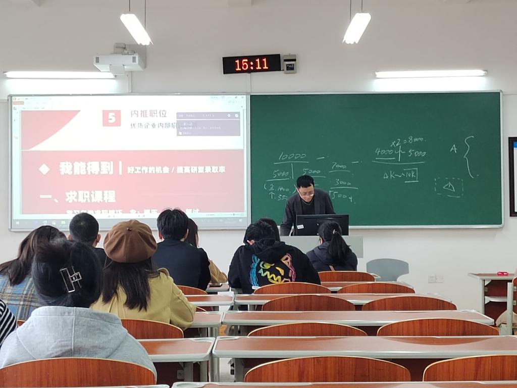 为提高毕业生对就业市场的认识,引导毕业生树立多元的就业观,进一步提高毕业生的求职能力,3月25日,公司邀请就业导师李想在博学楼2-504举办了就业专题宣讲会。2024届毕业生参加。