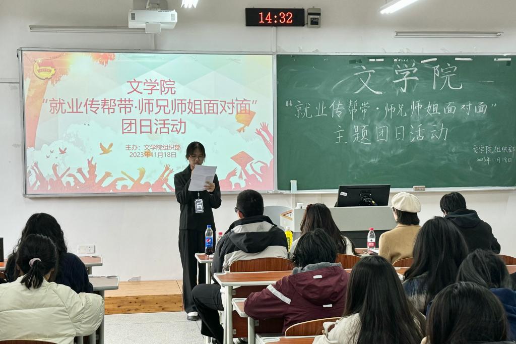 团日活动共分为以下五项流程:首先,观看就业相关视频,引导新生树立正确的就业观和择业观;其次,邀请师兄师姐讲述个人经历。在此过程中,他们强调了实践的重要性,鼓励新生要坚持探索、不断追求,更要学会倾听内心的声音,选择适合自己的道路。师兄师姐的经历开阔了新生的视野,也让新生进一步明确了今后的发展方向;再次,师兄师姐对新生提出的有关就业和考研的问题进行解答,帮助新生理清思路,更好地规划未来;然后,进入“角色扮演”环节。邀请师兄扮演职员,现场演绎真实的职场生活,让新生根据表演进行角色分析,引导他们深入了解职场现状,更加理性地就业、择业;最后,刘东进行活动总结。他强调新生应该提前做好学习规划和职业规划,制定清晰的发展目标。