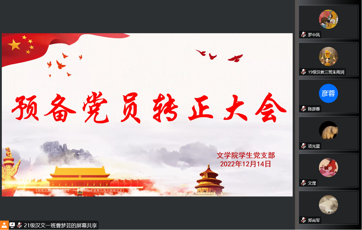 根据党支部发展党员工作计划,经党员和群众意见、支部委员会审查同意,公司党总支员工党支部于12月14日召开线上党员大会,讨论预备党员胡莉、杨礼仪等31名同志的转正问题。公司员工第一党支部书记张悦、员工第二党支部书记陈进、17名全体正式党员和31名预备党员参与此次会议。